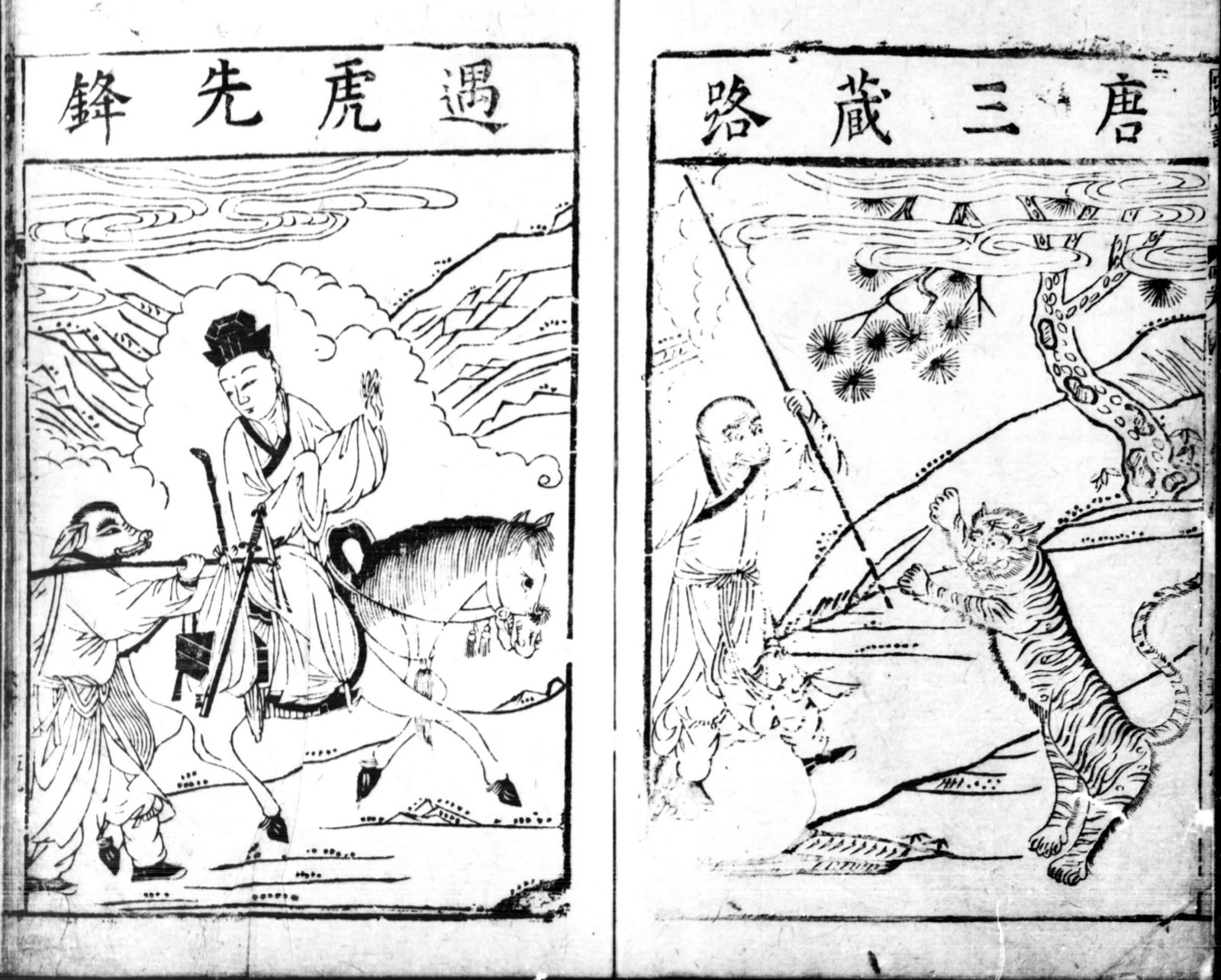“Slow down!” the tiger roared. “I am none other than the vanguard general for Lord Yellow Wind. On my lord’s command, I am patrolling the mountain to catch a few mortals for him to devour with his wine. Monk, where are you from? How dare you attack me with weapons?!”