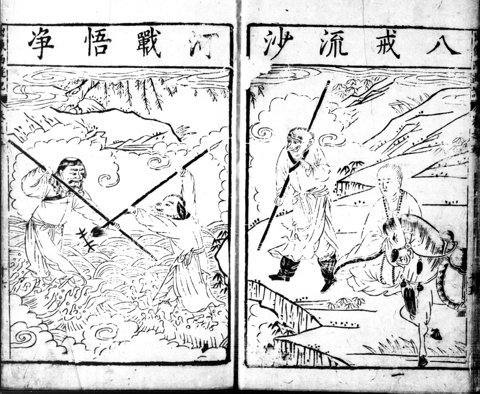 The two now returned to their master hand-in-hand while talking and joking. San Zang asked what happened, and Wukong told him that the monster had fled back into the river, which gave San Zang an idea.